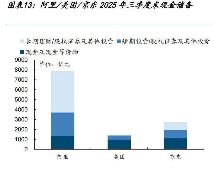 外卖大战参与者中阿里现金储备最充足。阿里/美团/京东经营活动现金流较去年同比二三 季度减少合计 343/517/281 亿元,三个平台自外卖大战以来经营活动现金流减少超 1 千亿元。截至三季度末,阿里/美团/京东现金及现金等价物+短期投资+长期投资等现金相关储 备分别为 7855/1417/2689 亿元,阿里现金储备最为雄厚。从造血能力看,电商广告的变 现能力及体量具备显著优势,参考 2024 年阿里/美团/京东经调整归母净利润分别为 1579/438/478 亿元,截至 25Q3 阿里/美团/京东 TTM 经营活动现金流分别为 1292/96/230 亿元,阿里年度产生的净利润及经营活动现金流最高,持久战下贮备最充足。